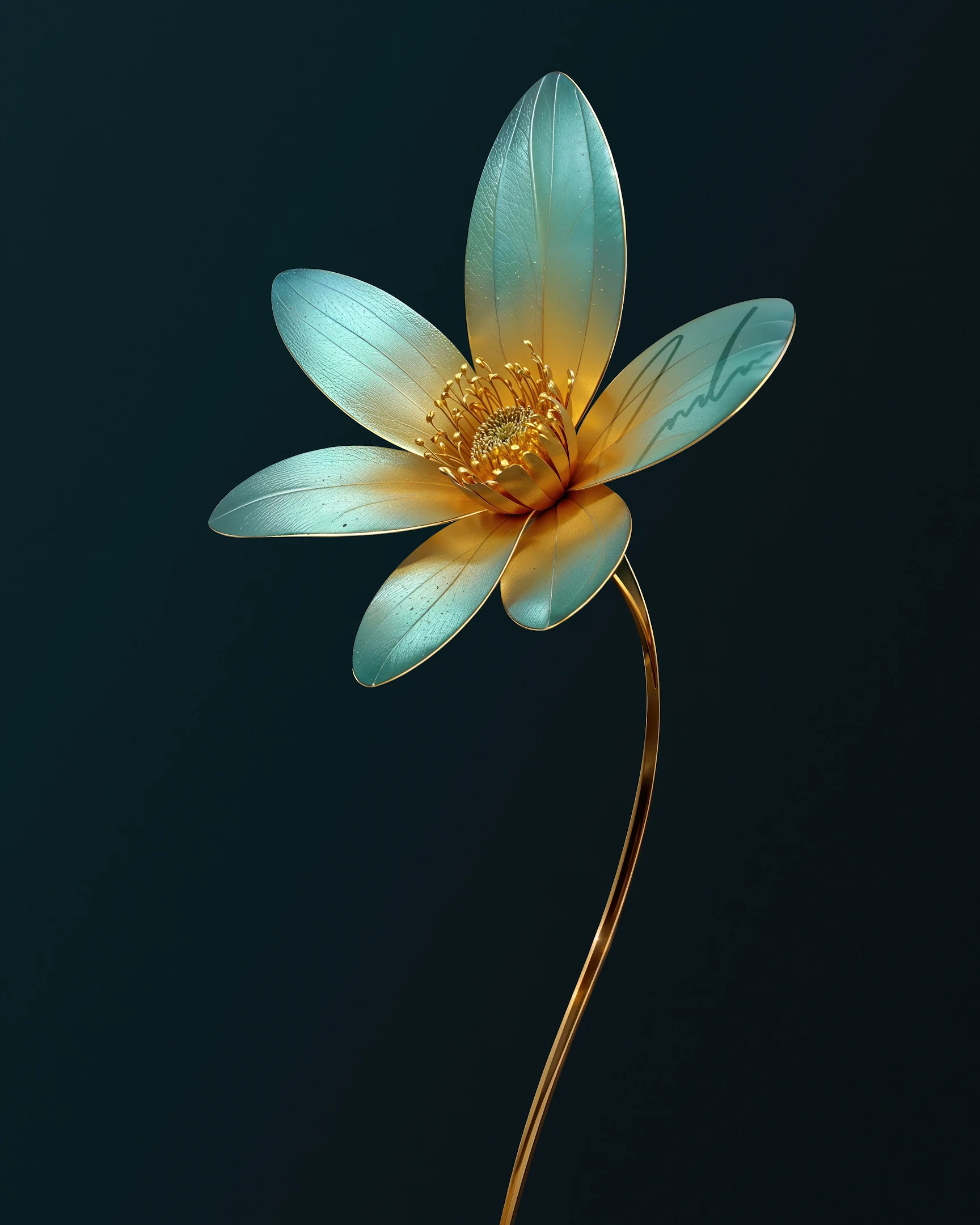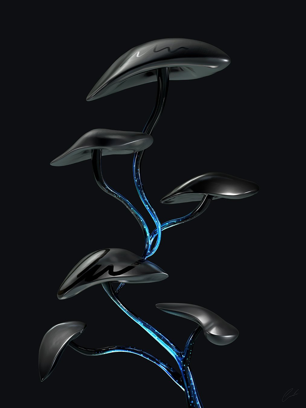 On a dark night, a black mushroom stands out in the gloom. Blue points of light shine on its trunk like a stream of vital energy. The same energy that flows through the Earth, uniting all living beings as one. This mushroom is a reminder that in nature, everything is interconnected and that God is the energy that binds us together.