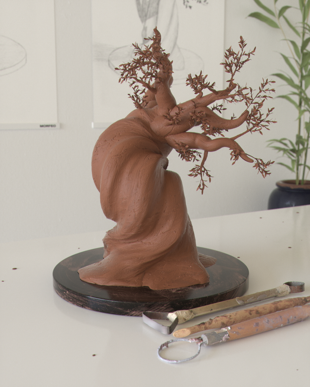 Based on the final drawing, a clay sculpture is produced in order to create a three-dimensional model. During this stage, the scale and shape are enhanced, resulting in a stunning organic sculpture.